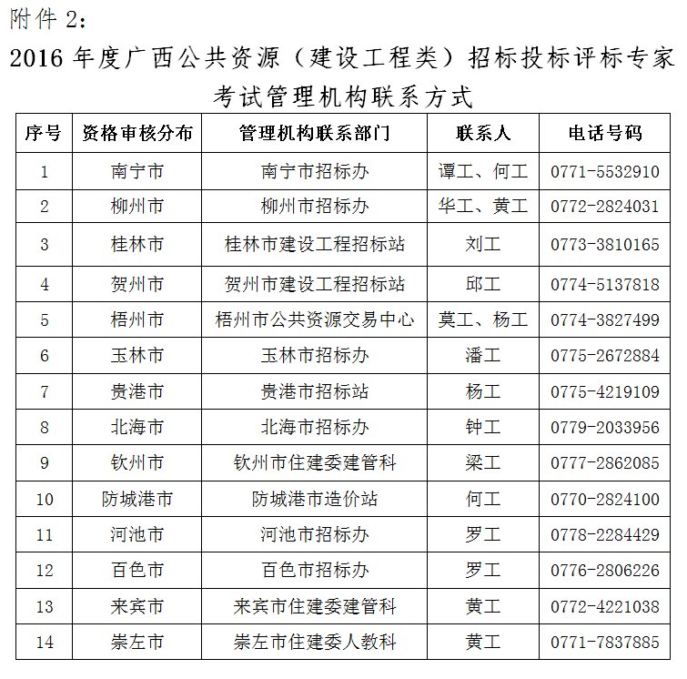 2.2016年度广西公共资源(建设工程类)招标投标评标专家考试管理机构联系方式