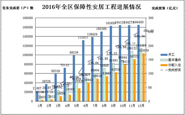(一)2016年保障性安居工程建设进展情况。2016年,国家下达我区目标任务为棚户区改造新开工16万套(户),新增发放住房租赁补贴0.47万户,基本建成7.1万套,分配入住7.58万套。截至12月25日,全区棚户区改造项目新开工16.44万套、1259.78万平方米,完成年度目标任务的102.75%;全区新增发放住房租赁补贴10923户,完成年度目标任务的234.65%;基本建成11.44万套、799.81万平方米,完成年度目标任务的161.11%;新增分配入住10.36万套,完成年度目标任务的136.65%;全区保障性安居工程完成投资254.22亿元,占全年计划投资242亿元的105.05%。