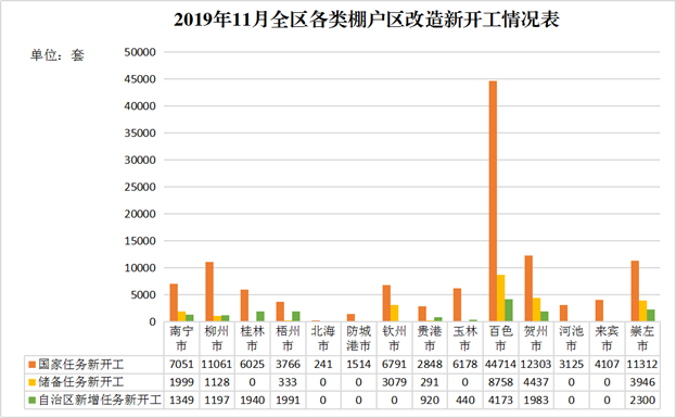 (一)全区棚户区改造新开工目标任务完成情况。2019年,国家下达我区棚户区改造目标任务为新开工12万套。截至2019年11月25日,全区各类棚户区新开工16.62万套,其中,国家下达任务新开工12.11万套,完成国家年度开工任务的100.86%;国家棚户区改造储备任务新开工2.64万套;自治区新增棚户区改造目标任务新开工1.87万套。自治区新增任务开工率达20%以上的设区市有桂林市(36.67%)、梧州市(23.70%)、贺州市(92.36%)和崇左市(25.24%);尚无项目开工的有北海市、防城港市、钦州市、河池市和来宾市。