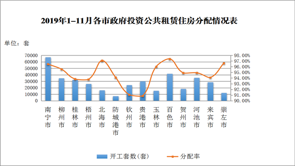 (一)全区公共租赁住房分配目标完成情况。截至2019年11月底,我区列入国家计划的公共租赁住房累计开工建设47.17万套,已分配44.03万套,分配比例为93.34%。其中,列入国家计划的政府投资公共租赁住房(不含已依照规定盘活的公共租赁住房)累计开工建设39.27万套,已分配37.20万套,分配比例为94.72%。