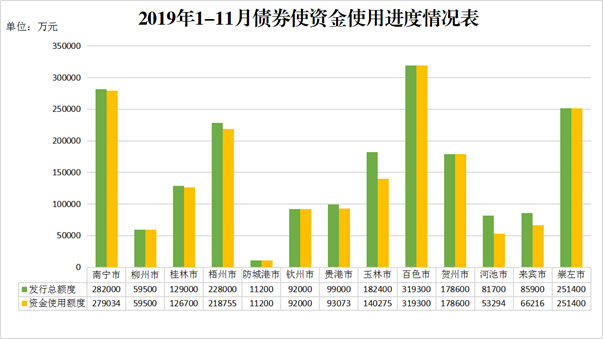 目前,柳州市、防城港市、钦州市、百色市、贺州市和崇左市两期债券资金均已完成使用。部分城市两期债券资金平均使用进度较慢,其中使用率低于全区水平(94.47%)的设区市有玉林市(76.90%)、河池市(65.23%)和来宾市(77.08%)。第一期债券资金中,玉林市(93.06%)、贵港市(84.14%)和来宾市(78.23%)尚未完成使用;第二期债券资金中,南宁市(98.87%)、桂林市(98.02%)、梧州市(92.78%)、玉林市(67.88%)、贵港市(95.51%)、河池市(45.58%)和来宾市(76.56%)暂未完成使用。
